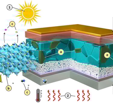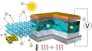 (EXTRACTED ABSTRACT): The transition to renewable energy sources could be the most pressing technological challenge of our time, as the high demand and use of fossil fuels cause overpopulated transportation channels, contamination, global warming, and unintentionally fund wars. In resolve of the global energy crisis, photovoltaics is an elegant solution to a non-exhaustive source of energy, the sun. With solar generated electricity, the need for an extensive grid could be reduced, and a solar panel is only producing costs (apart from area and/or cleaning) and waste at the start and end of its life. Perovskite Solar Cells (PSCs) show promise for flexible, cheap and lightweight photovoltaics. These tuneable photovoltaic devices could revolutionize off-grid power supply and can bring the technology to places and applications previously not possible. Stability guarantee is the main hurdle that stands in the way of PSC comercialization. With many potential instability-phenomena, both reversible and irreversible, the PSC performance decreases over time or fails suddenly, thus further understanding is needed. Detection of initial instability under any unavoidable stressors that PSCs need to endure will be more important in ever more durable PSCs. The studies in this thesis aim to develop characterization procedures that lead to greater understanding of the PSC system under operation in regards to physical and chemical processes. Several in-situ operational stability tests were performed using X-ray diffraction (XRD), photoluminescence (PL) and electrochemical impedance spectroscopy (EIS). Comparison studies with PSCs using stability-enhancing modifications such as perovskite precursor additive engineering and interfacial layers led to discoveries of both degradation phenomena and actuation of the additives. In general, the thesis work demonstrated advantages with in-situ methods towards understanding reversible and irreversible decline in PSC by revealing several degradation phenomena, specifically related to strain-provoked breakdown. Findings include lattice expansion by excess carrier conditions and their relation to interfacial ionic barrier formation, interfacial strain during thermal expansion, and the relation of grain surface decomposition with ion conductivity at elevated temperatures. The conclusions of this work regarding the efficacy and limitations of phosphonate additives and MXene interlayers to stabilize PSC set a roadmap for further stability-enhancing efforts and evaluations. The principal take-home messages from this thesis are the added value provided by in-situ characterization during stability analysis, the relation of strain to reversible and irreversible degradation phenomena in PSCs, and additive engineering strategies to enhance PSC lifetimes.